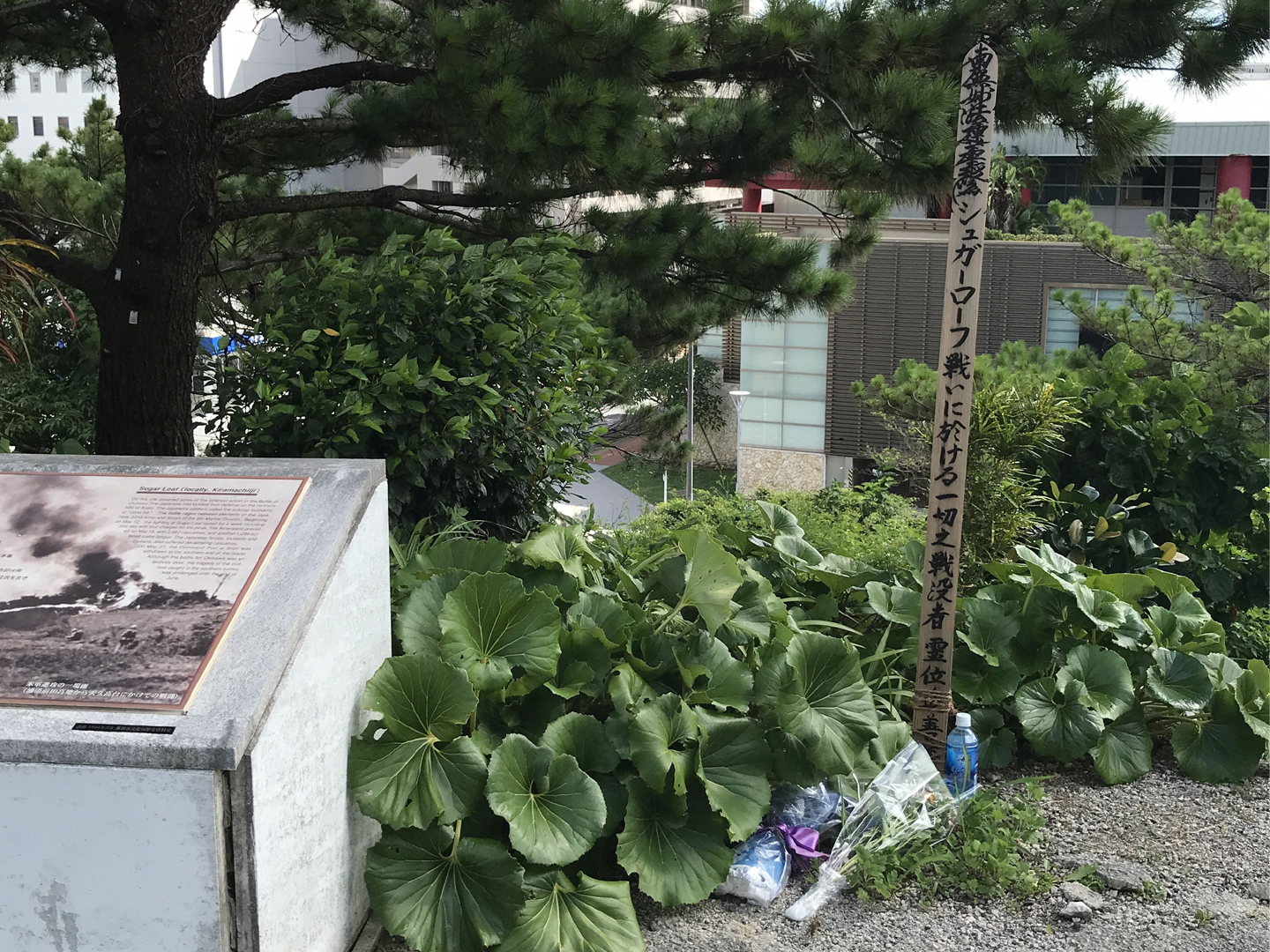 沖縄県庁前からモノレールの“ゆいレール”に7分ぐらい乗ると、激戦地となった安里52高地(シュガーローフ)がある那覇市の新都心おもろまちに到着する。敗戦直後に米軍の住宅地区として接収され、その後日本へ返還されて、90年代後半から開発された街である。街は整然とした道路が施設され、複数の大きなショッピングセンターや公園、高層マンション、県立博物館などが建ち並ぶ。その一角の給水タンクのところにシュガーローフの戦いの慰霊塔はある。分かりにくい所に設置されているのもあって、普段は人があまりいないのであるが、慰霊の日の朝は、地味な色のかりゆしを着たおそらく近所の人、休日出勤前のサラリーマン風の人、間を置かずにお参りの人がやってきていた。夕方の地元ニュースで知ったのであるが、供えられた花には、沖縄在住のウクライナ人有志からのものもあったらしい。